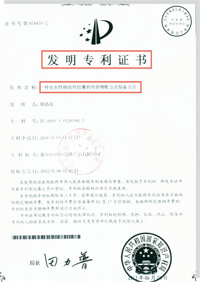 2012年6月,国家知识产权局传来喜讯,由浙江江山蜂产品有限公司研制的一种亲水性蜂胶软胶囊内容物配方获得了国家发明专利,其发明专利号为ZL 20100126306.3。
